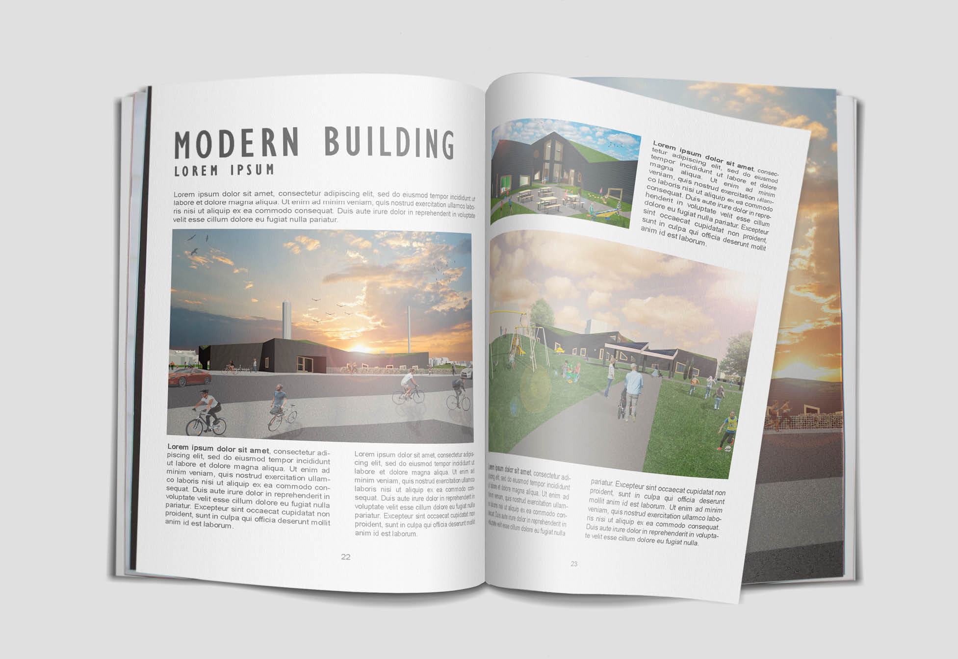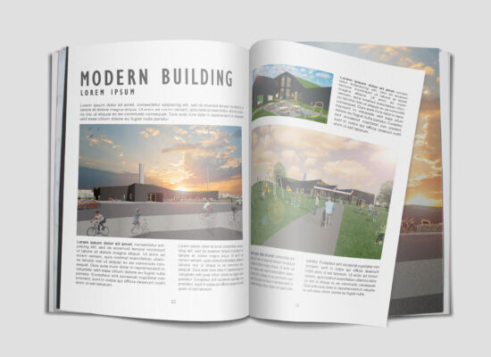Projekt: Billederne er redigeret således at der skabes mere liv og bevægelse omkring bygningen (børnehave). Der er her blevet lagt beplantning/belægning såsom træer, græs og grus og har desuden fået sat en himmel, mennesker, biler, cykler mm ind så det gør billederne mere attraktive at se på