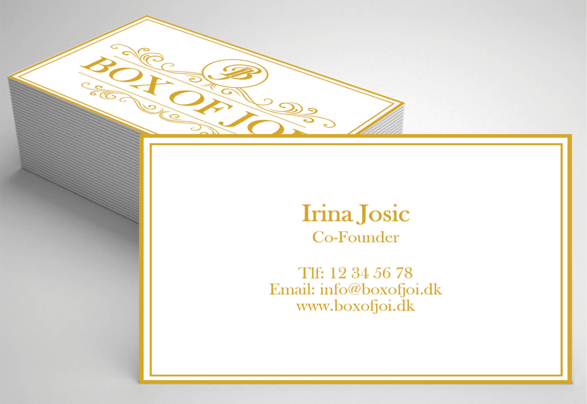 Projekt: Til denne opgave blev der lavet en visuel identitet for en nyopstartet virksomhed der hedder Box Of Joi, som er en firma der kommer til at sælge forskellige bokse. Nogle er med blomster, andre med søde sager. Her blev der lavet forskellige produkter til firmaet, bl.a. visitkort, klistermærker mm med deres nye logo og bomærke.